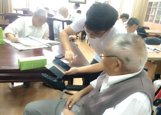 在派礼小分队慰问寿星老人之际,我们的另一组检修小分队正在福利院提供的多功能厅为老人们检测电子产品,解决老人们的实际难题。