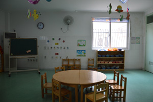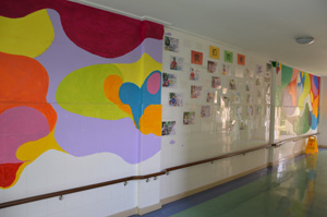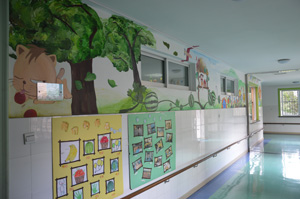 简短的捐赠手续办理完后,我们在工作人员的带领下,一起参观了福利院的生活区。干净明亮的走廊,湖绿色的地面,点缀着可爱卡通画的墙面,福利院处处充满着童趣和纯真。