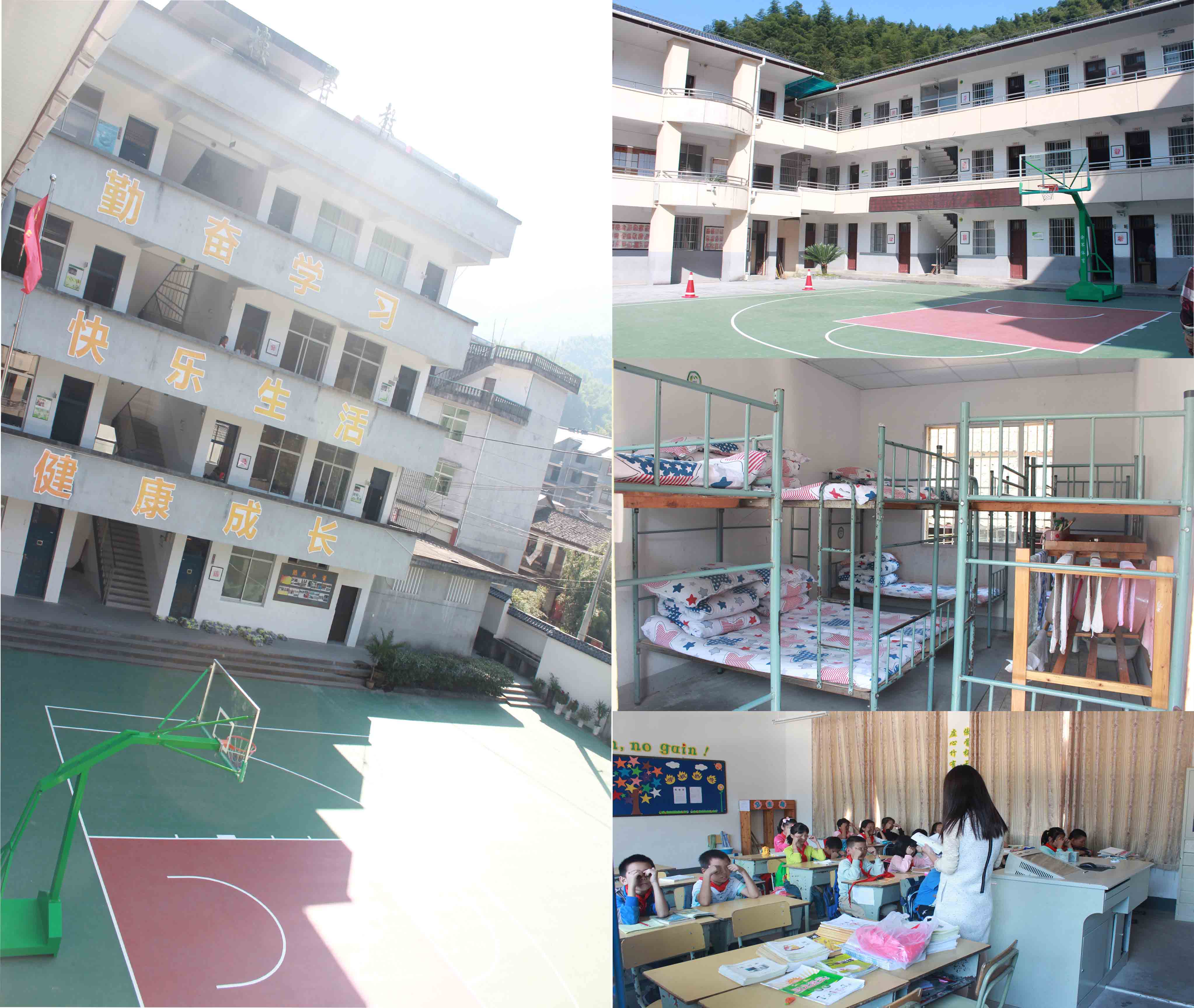 在简短的交流过后,许校长与副校长带领我们参观了学校。学生的宿舍床还是我们学生时代熟悉的上下铺铁床,简陋却整洁,统一的三件套与被子是一家热心企业捐赠给学校学生的。也正因此,孩子们终于可以温暖的度过山区格外寒冷的冬天,而不会再像以前那样常常在半夜里冷醒。由于教学资源有限,为了满足乡里适龄儿童上学的需求,竹源乡的幼儿园就安置在教学楼下一角的两间教室中,幼儿园的布置简单而又温馨。唯一不同的是其他幼儿园的小朋友可以在大大的游乐区尽情地玩各色各样的游乐设施,而他们拥有的仅是狭小过道上安放的一个塑料滑梯和几个橡胶木马。