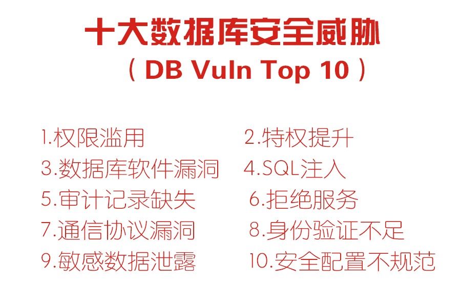企业组织的数据库体系,不仅仅是数据库软件平台本身,不会流动的数据没有意义,当我们考虑数据库安全的时候,显然我们需要合理评估数据库的受攻击面大小;数据库访问涉及的认证、授权和审计问题;由于开发人员疏忽带来的软件漏洞和运维人员的管理不善导致的潜在风险等,不难发现在实际运维中,各种各样的风险都可能产生并带来可怕的后果。笔者实验室通过收集各漏洞平台及企业安全运营者的反馈数据库安全信息,参考OWASP TOP 10制定了数据库应用防御的十大数据库风险威胁列表。