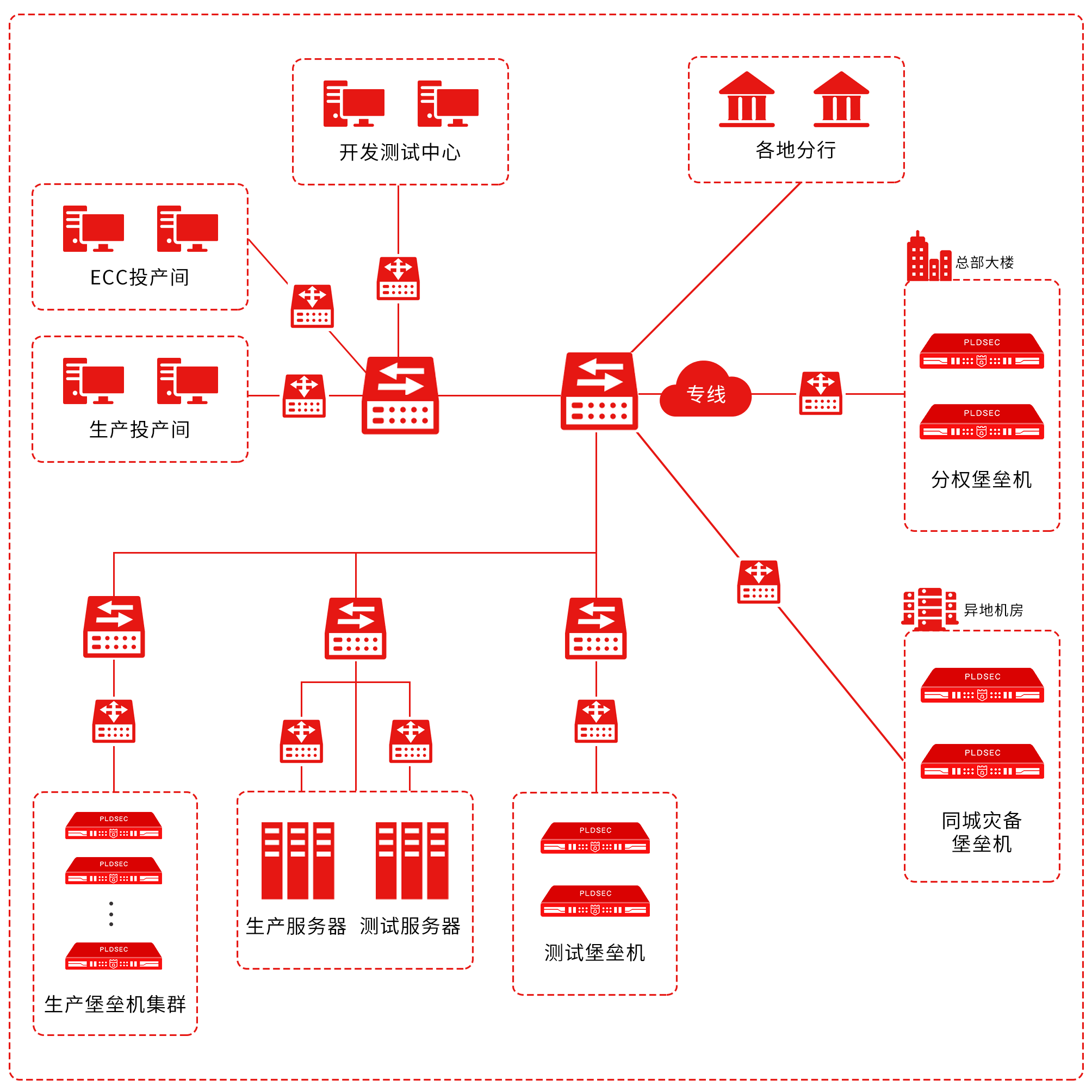 #2#:总行采用2台分权模式堡垒机(类SAAS模式),各地分行通过分权模式划分各个部门,部门内部资源自治互不干涉;