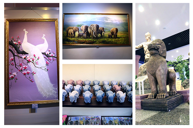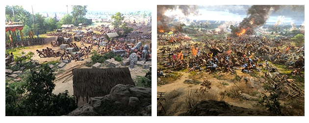 馆中360°远景绘画,展现了吴哥王朝的兴衰,画面前端是实景,后端是纯手工绘制,二者衔接天衣无缝,仔细端倪也很难相信是纯手工绘制的场景,其规模有四个篮球场大小,画师超群技艺让人叹服。