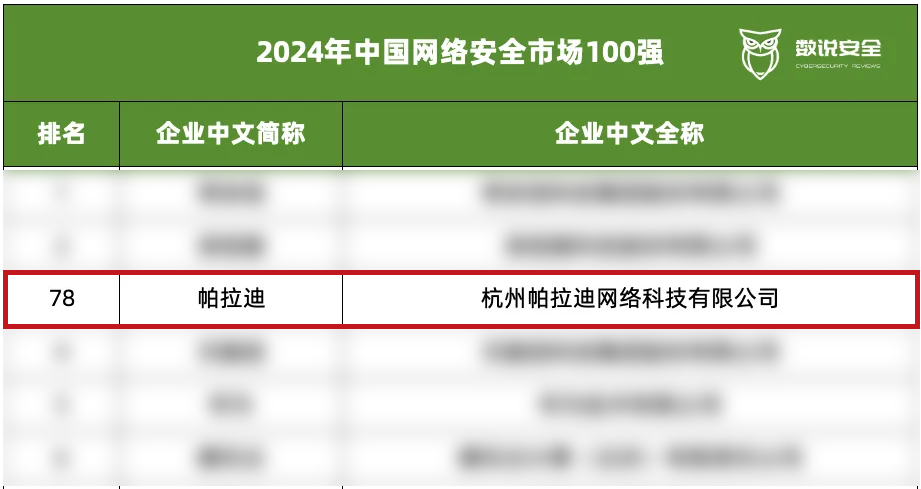 此次入围数说安全《2024中国网络安全市场100强》,是对帕拉迪多方面优势的高度认可。未来,帕拉迪继续秉持 “垂直专精” 的技术发展理念,不断提升核心竞争力,为客户提供更加完善的网络安全产品和解决方案,赋能企业数字化转型升级,共创网络安全繁荣生态。