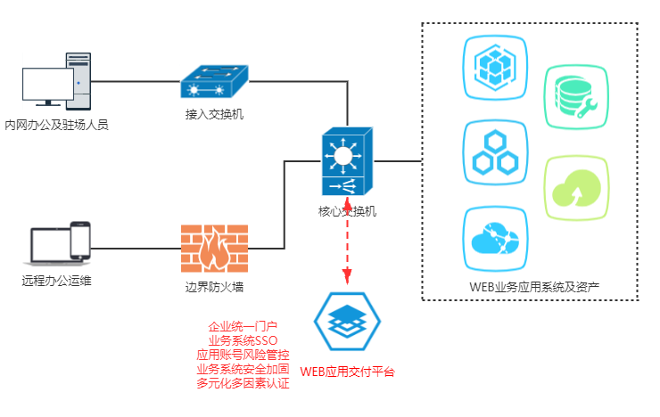 WEB应用交付平台以Core4A为核心基础模块,为企业打造“应用统一门户”、“业务应用单点登录”、“业务账号集中管控”以及“统一审计追溯和威胁分析”的企业生态平台。