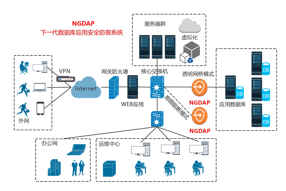 帕拉迪下一代数据库应用安全防御系统(简称NGDAP)是杭州帕拉迪网络科技有限公司自行研制开发的新一代数据防护系统。NGDAP通过对访问数据库的数据流进行采集、分析和识别。实时监视数据库的运行状态,记录多种访问数据库行为,发现对数据库的异常访问,并进行及时的阻断。通过特有4道防火墙构建数据库的最高安全防护体系: